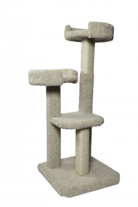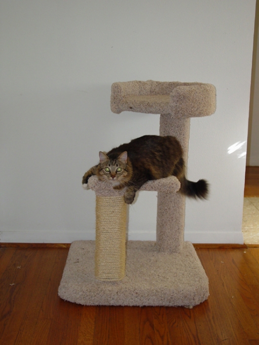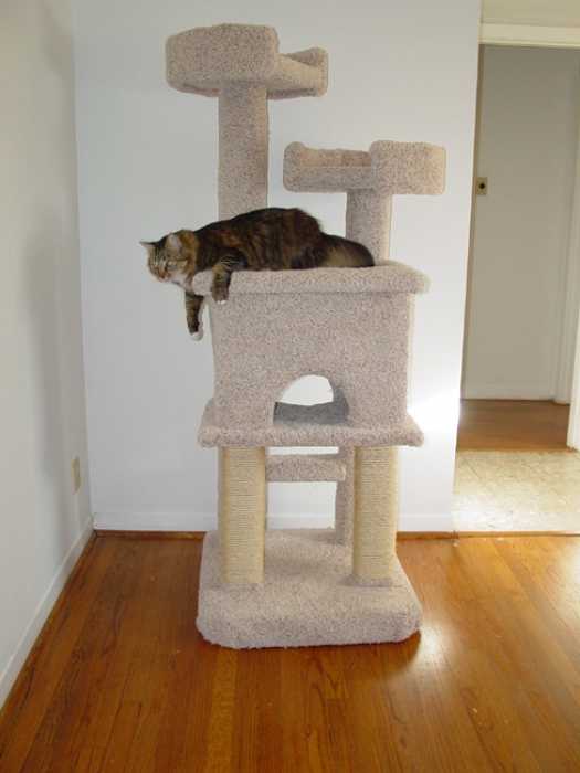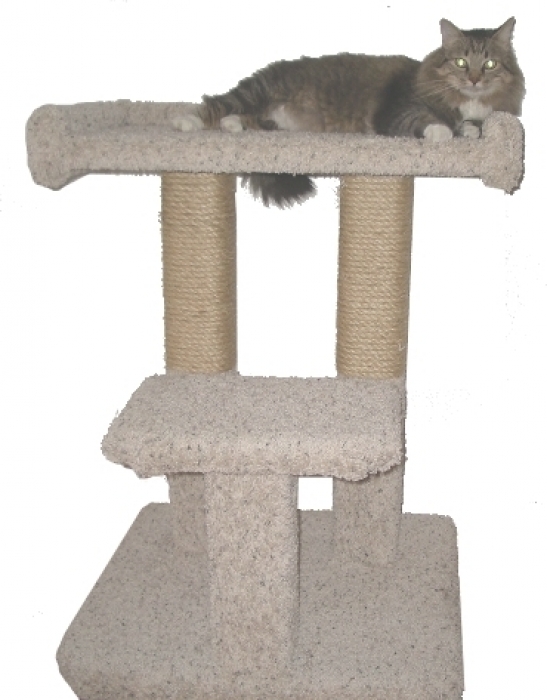 The 2 Tier Cat Condo is a favorite here at Fandango. It is a solid built conventional style tree which weighs about 90 lbs. It has a large house in the middle with big openings. All 4x4 construction with a 25" x 25" base which allows it to free stand at a towering 6ft. Two large areas to scratch and easily climbing from the back into the house and up to the top! Can be built shorter if requested at no additional charge!